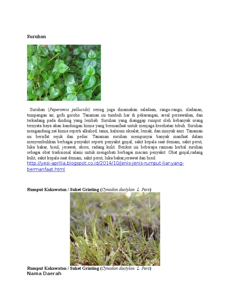 Rumput yang dipakai adalah jenis rumput grinting (cynodon dactylon), yang kemampuan bertahan hidupnya bisa lebih lama dibandingkan rumput jenis lain, jelasnya. Rumput grinting juga mampu bertahan hidup saat musim kemarau yang berkepanjangan. Selama ribuan tahun, khasiat obat dan klinis dari rumput bermuda telah digunakan di ayurveda dan sidha medicine, kata acharya. Check spelling or type a new query. Ambil salah satu tanaman/bagian dari tanaman;